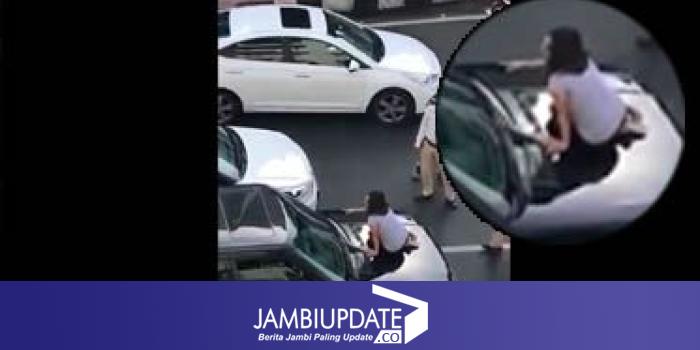 Bahkan saking emosinya, dia naik ke atas kap mesin mobil lalu melepas alas kakinya dan melempar kaca depan mobil. Sopir dan penumpang mobil itu pun tak juga keluar dari mobil.