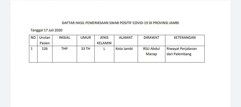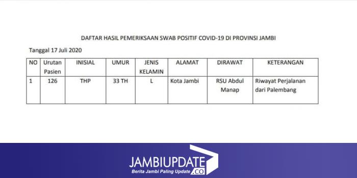 "Pasien 126 ini berinisial THP, laki-laki umur 33 tahun dirawat di RSUD Abdul Manap, riwayat perjalanan dari Palembang," sampai Johansyah.