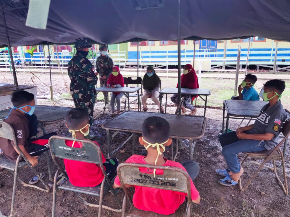 Sementara, Serma Arman Dedi, anggota Satgas mengenalkan Pancasila kepada anak SD disaat mereka bermain di Poskotis yang kebetulan berada satu lokasi dengan SD Negeri 109/X Labuhan Pering.