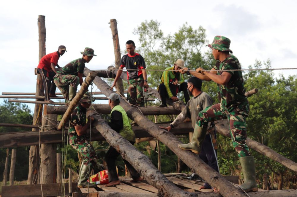 Beragam cara dilakukan oleh anggota TNI untuk menciptakan kerukunan dan keharmonisan dengan masyarakat setempat, seperti yang dilakukan anggota Satgas TMMD di Desa Labuhan Pering bersama masyarakat melaksanakan gotong royong dalam pemasangan galar/papan lantai jembatan darurat yang menghubungkan jalan baru dari RT. 01 ke RT. 04 di Dusun 1 Desa Labuhan Pering, Kecamatan Sadu, Kab. Tanjab Timur.