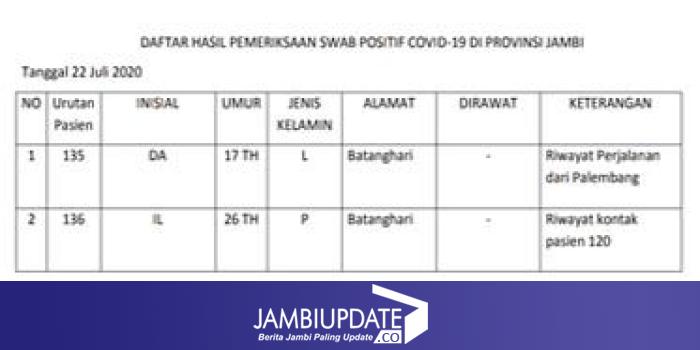 JAMBIUPDATE.CO,JAMBI - Juru bicara Satgas Covid19 Provinsi Jambi mengumumkan 2 pasien terkonfirmasi Covid19 pada hari ini (22/7). Keduanya berasal dari Kabupaten Batanghari dan belum ada keterangan tempat perawatan.