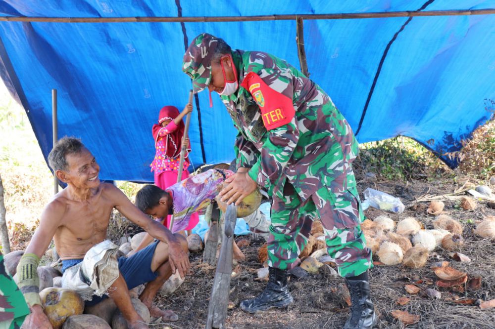 “Anggota Satgas TMMD senantiasa selalu berusaha untuk berbaur dengan warga setempat agar Kemanunggalan TNI dengan Rakyat melalui Komunikasi sosial bisa terjalin dengan baik, hal itu terlihat saat Pasiter Satgas TMMD Kapten Inf Safri Napitupulu ikut membantu warga sedang bekerja upahan mengupas kelapa di Dusun 1 Sungai Kapas Desa Labuhan Pering, Kamis (23/7/2020).