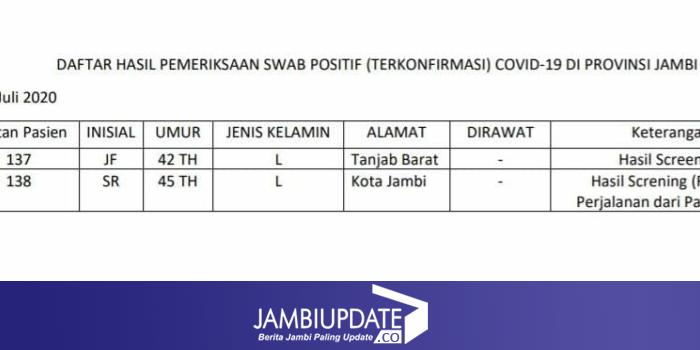 JAMBIUPDATE.CO, JAMBI - Pasien terkonfirmasi (Positif) Covid19 bertambah 2 orang pada hari ini (24/7). Keduanya berasal dari Kabupaten Tanjab barat dan Kota Jambi.