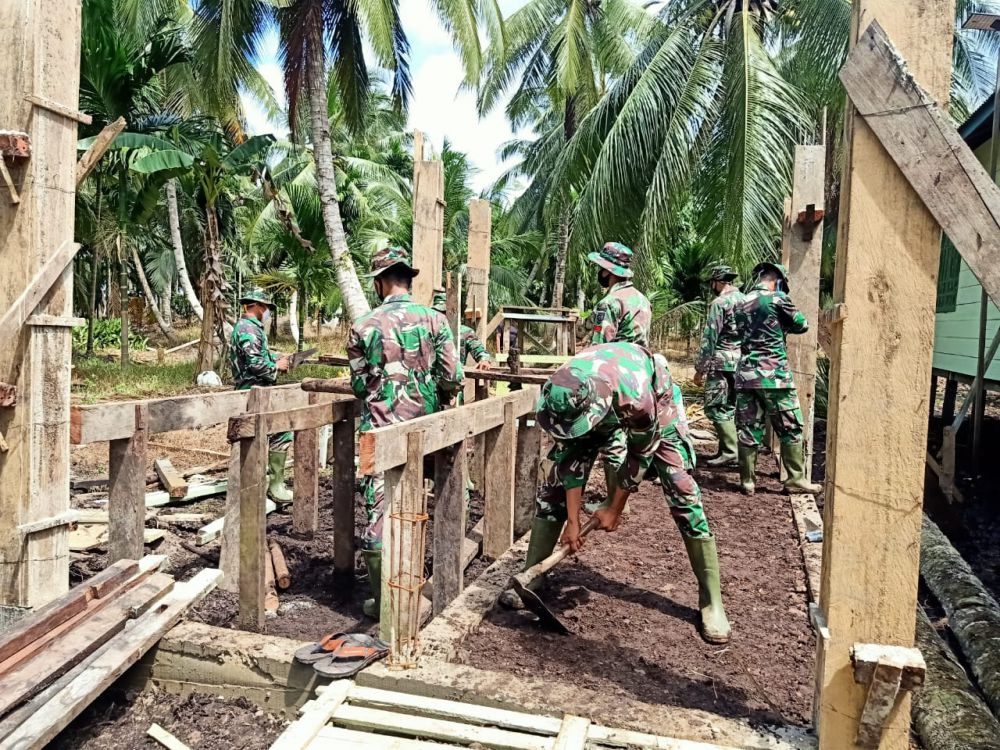 Terpantau di Lapangan, Pengerjaan oleh Satgas TMMD bergotong-royong dengan masyarakat sedang membangun tiang dan tongkat toilet. Tampak suasana pekerjaan di mana Satgas dan Masyarakat saling membagi tugas.