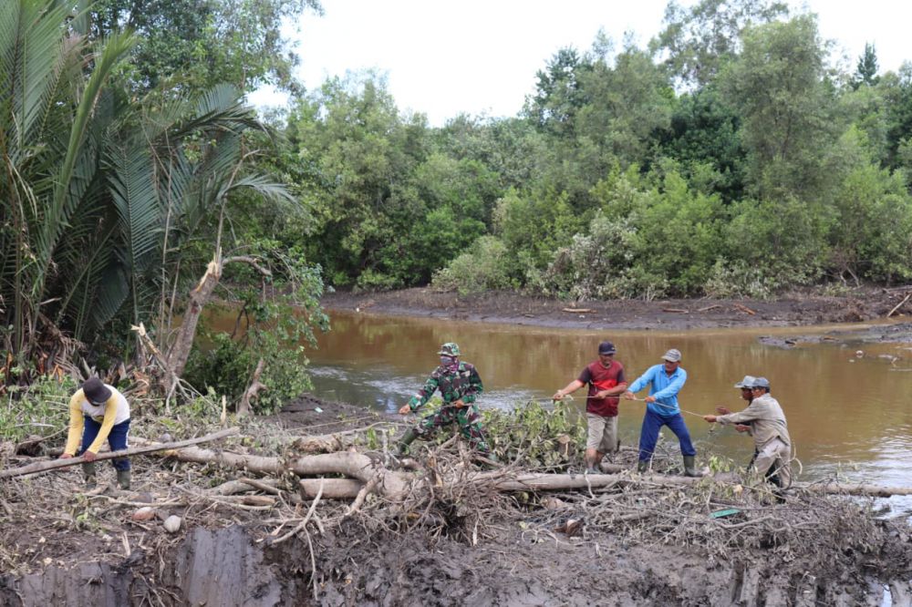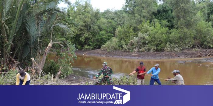 JAMBIUPDATE.CO, JAMBI - Anggota Satgas TMMD 108 Kodim 0419 Tanjab, Serda Dedi Arman bersama warga mengambil bahan material kayu untuk jembatan darurat di Sungai Desa Labuhan Pering, Kecamatan Sadu, Kabupaten Tanjab Timur, Kamis (23/7/2020).