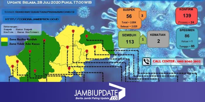 Sementara untuk data total kini, Provinsi Jambi ada 139 kasus. Dimana 24 masih dirawat dan 113 dinyatakan sembuh.