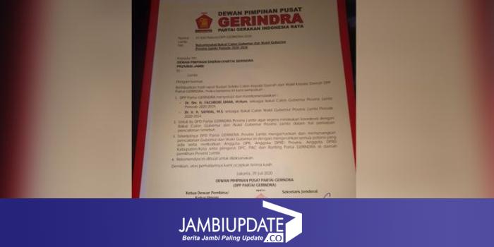 JAMBIUPDATE.CO, JAMBI- Surat rekomendasi dukungan partai Gerindra untuk kontestasi politik Pemilihan Gubernur (Pilgub) Jambi Desember mendatang, beredar di Medsos.
