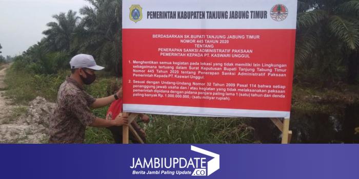 JAMBIUPDATE.CO, MUARASABAK - Pemerintah Kabupaten Tanjung Jabung Timur (Tanjabtim), melalui Dinas Lingkungan Hidup (DLH) menyegel lahan PT. Kaswari Unggul di Desa Catur Rahayu, Kecamatan Dendang, Kamis (30/7) siang.