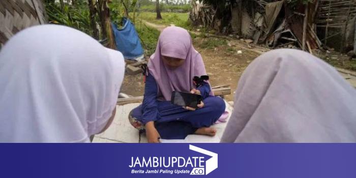 iklan Tiga siswi melakukan belajar bersama di depan halaman rumah yang terlihat tak layak para siswi sekolah dasar giat melakukan belajar dengan bergantian menggunakan telepon selular (belajar daring), sebagian besar siswa kelas satu tidak memiliki alat komunikasi telepon pintar sebagai pendukung belajar secara daring, Kabupaten Tangerang, Banten. (26/7). FOTO: FAISAL R. SYAM / FAJAR INDONESIA NETWORK.