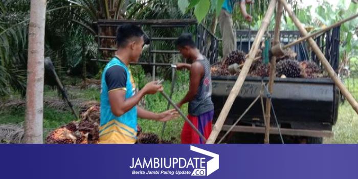 Petani Desa Lambur, Kecamatan Muara Sabak Timur, saat panen buah sawit. (Lana / Jambiupdate)