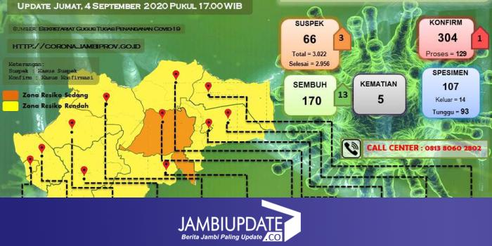JAMBIUPDATE.CO, JAMBI - Sebanyak 13 pasien Covid19 di Provinsi Jambi dinyatakan sembuh pada Jumat (4/9). Total kini pasien sembuh sudah 170 orang mengalahkan jumlah pasien yang masih terpapar Covid19 sebanyak 129 orang.