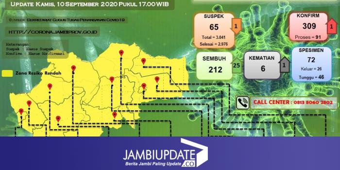 JAMBIUPDATE.CO, JAMBI - Pasien Covid19 yang meninggal dunia hari ini (10/9) berasal dari Kabupaten Batanghari. Pasien perempuan nomor 308 ini baru satu hari dinyatakan positif Covid19 dan mendapat perawatan di RSUD Hamba pada Rabu 8 September, kemarin.
