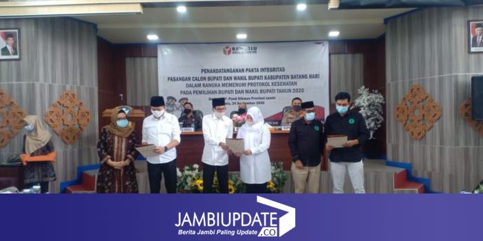 JAMBIUPDATE.CO, BATANGHARI - Badan Pengawas Pemilihan Umum (Bawaslu) Kabupaten Batanghari menggelar kegiatan Penandatanganan Pakta Integritas Pasangan Calon Bupati dan Wakil Bupati Kabupaten Batanghari dalam rangka memenuhi protokol kesehatan pada pemilihan Bupati dan Wakil Bupati tahun 2020. Kamis (24/09).