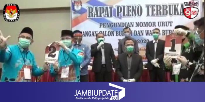JAMBIUPDATE.CO, MUARA BUNGO - Pencabutan nomor urut pasangan calon Bupati dan Wakil Bupati Bungo sudah dilaksanakan oleh Komisi Pemilihan Umum (KPU) Kabupaten Bungo di Amaris Hotel Muara Bungo, Kamis (24/9).