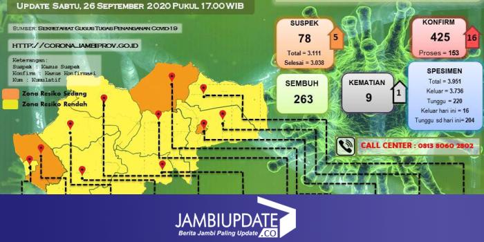 JAMBIUPDATE.CO,JAMBI - Juru bicara gugus tugas Covid19 Provinsi Johansyah mengumumkan 16 pasien tambahan pasien positif pada (26/9). Yang terbanyak 15 orang berasal dari Kota Jambi dan 1 orang asal Kabupaten Tanjab barat.