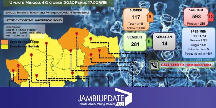 JAMBIUPDATE.CO, JAMBI - Juru bicara Satgas Covid19 Provinsi Jambi Johansyah mengumumkan 22 pasien positif pada hari ini, Minggu (4/10). Satu orang dianttaranya merupakan Bupati Muaro Jambi Masnah Busro.