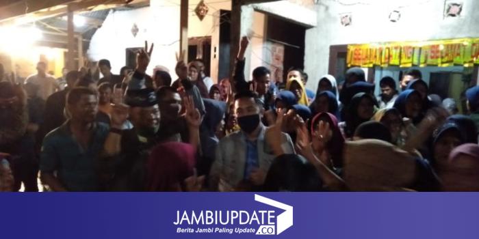 JAMBIUPDATE.CO, SUNGAIPENUH - Sambil mengacung jari menunjukan simbol no 2,ibuk -ibuk dan warga simpang tiga rawang sambut kedatangan Calon Walikota Sungai Penuh Fikar Azami.