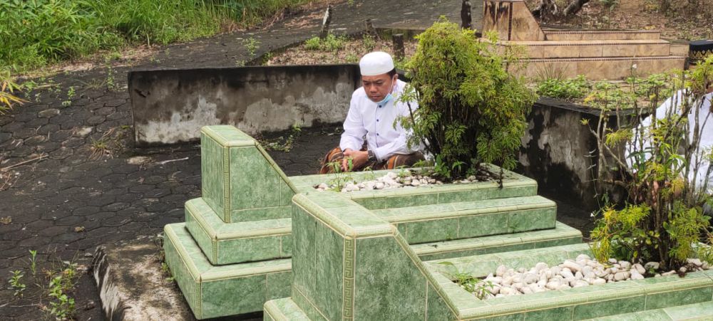 Al Haris juga membersihkan rumput kecil diatas makam keluarga mantan gubernur Jambi.