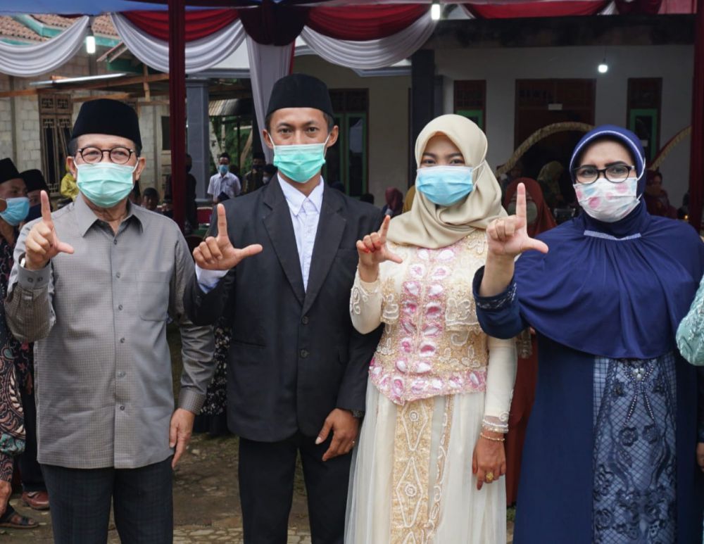 Dengan mengunakan protokol kesehatan, Fachrori disambut oleh kedua mempelai dan juga masyarakat yang hadir.