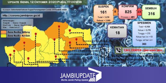 JAMBIUPDATE.CO, JAMBI – Sebanyak 13 orang positif Covid19 tambahan diumumkan pada hari ini (12/10). Semuanya berasal dari Kabupaten Sarolangun.