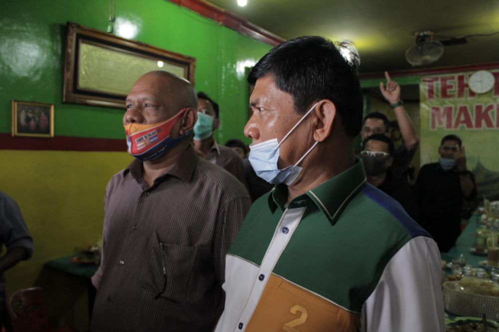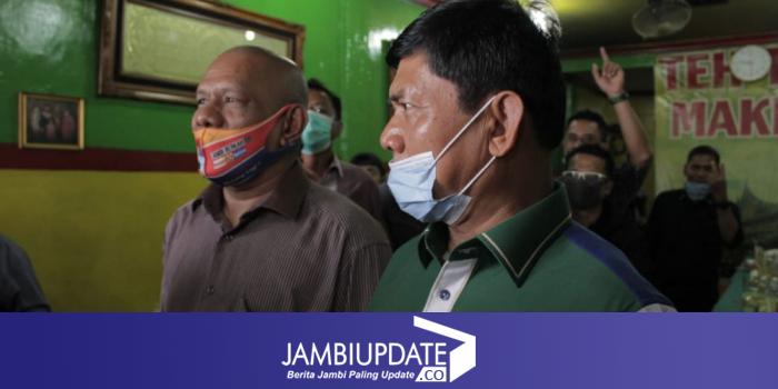 JAMBIUPDATE.CO, JAMBI - Calon wakil gubernur Jambi nomor urut 2 Syafril Nursal mengejutkan pengunjung sate Edi, di kawasan Tugu Juang, Kota Jambi, Senin pagi ini 12/10/20.