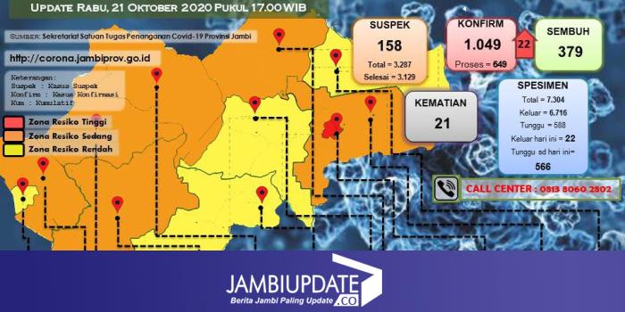 JAMBIUPDATE.CO, JAMBI - Kasus Covid19 di Provinsi Jambi kembali bertambah 22 orang pada (21/10). Terbanyak berasal dari Kabupaten Tanjab barat sebanyak 10 orang.