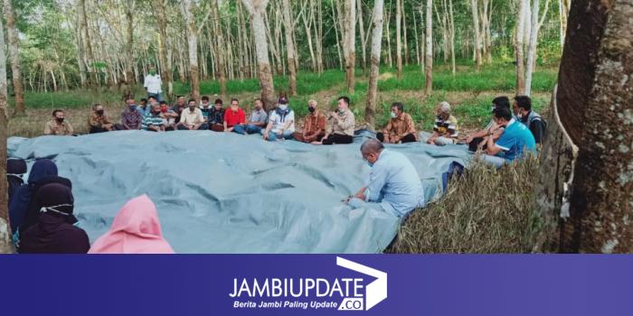 Al Haris dialog dengan petani di tengah kebun karet warga di Dusun Suka Damai, Pondok Meja, Mestong. Al Haris yang masa kecilnya juga nyadap karet mengatakan sengaja masuk kebun untuk melihat dan menyerap aspirasi petani karet.