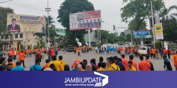 Tampak mahasiswa yang bergabung dalam aksi ini menggunakan almamater Universitas Jambi, Universitas Batanghari, UIN STS dan perguruan tinggi lainnya di Jambi. (aba)