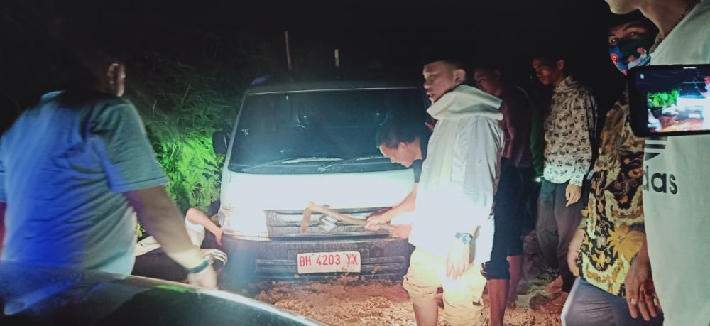 Bahkan ditengah perjalanan menuju dusun Kelapa Kembar, Al Haris ikut turun mendorong mobil warga yang tidak bisa bergerak karena masuk kubangan.