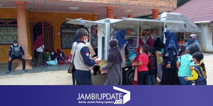 Perpustakaan keliling bantuan SKK Migas - PetroChina Jabung menyambangi anak-anak di Dusun Betara 8, Desa Terjun Gajah, Kecamatan Betara, Tanjung Jabung Barat, Sabtu 7 November 2020.