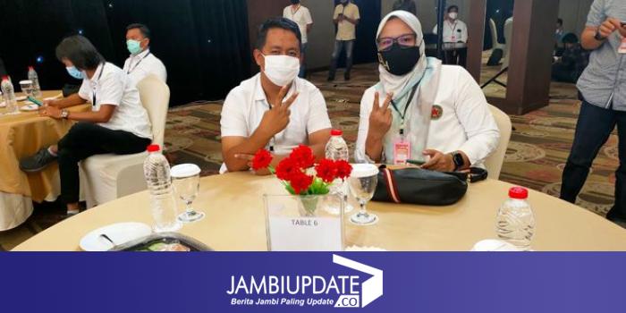 JAMBIUPDATE.CO, JAMBI - Usai debat publik, Dilla Hich memberikan apresiasi kepada Romi dan Robby dalam menyampaikan paparan dalam debat publik yang diselenggarakan pihak KPUD Kabupaten Tanjabtim, Senin (9/11) malam di Swiss Belhotel Kota Jambi.