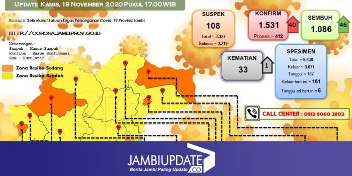 Total kasus Covid19 di Jambi sebanyak 1.531, dengan rincian, masih sebanyak 412 pasien positif yang sedang dirawat, dengan 1.086 pasien sudah sembuh. "Serta ada 33 kasus meninggal dunia dan 6 spesimen swab yang masih ditunggu hasilnya," sebut Johansyah.
