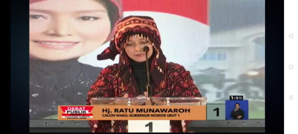 Cawagub nomor urut 1 Ratu Munawaroh mendapatkan kesempatan pertama menjawab pertanyaan panelis terkait kebijakan untuk menciptakan birokrasi yang profesional dan bersih dari KKN.