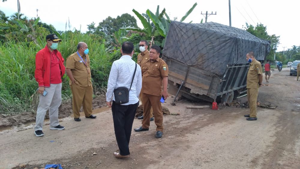 Dalam perjalanan meninjau kondisi jalan, Edi dan rombongan berpapasan dengan satu truk angkutan yang terperosok di salah satu titik jalan rusak. Saat rombongan menuju arah pulang ke kota Jambi, angkutan tersebut belum berhasil berpindah dari tempat terperosoknya. (*)