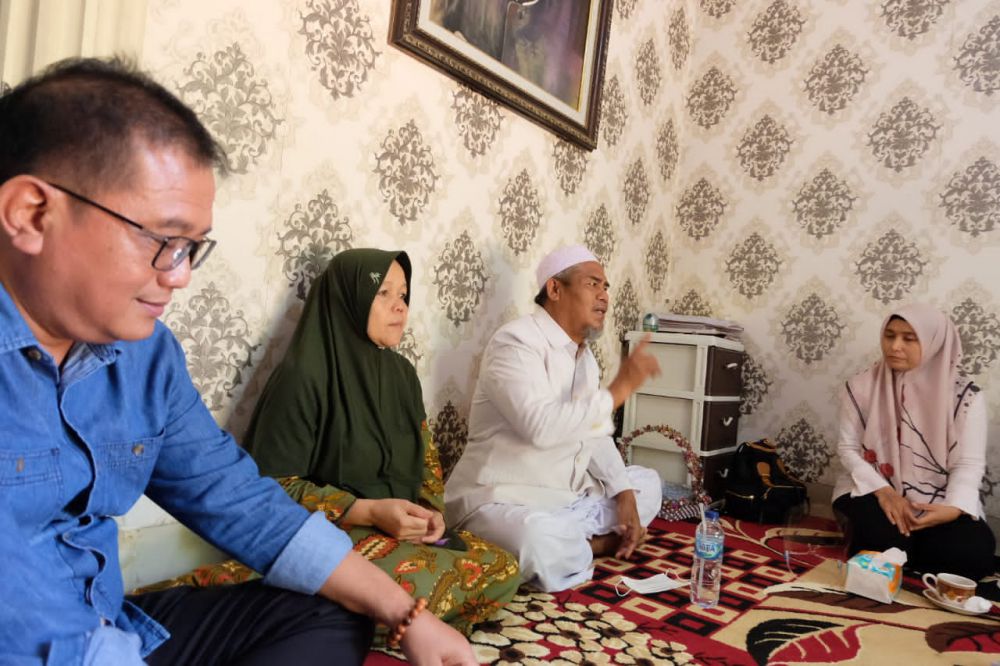Mengenakan pakaian muslimah dan jilbab berwarna putih, Ratu Munawaroh sowan ke kediaman ulama kharismatik KH Rifa'i Ahmad, Pimpinan Pondok Pesantren Darul Hikam di Desa Suka Damai, Kecamatan Rimbo Ulu, Kabupaten Tebo, Selasa (1/12/2020) pagi.