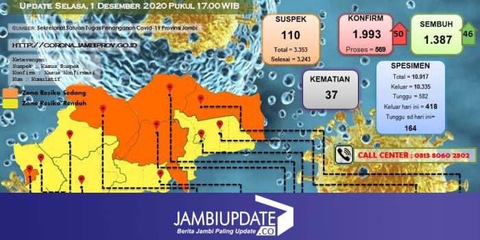 JAMBIUPDATE.CO, JAMBI - Tidak terdapat tambahan pasien meninggal dunia akibat Covid19 pada Selasa (1/12) di Provinsi Jambi. Angka kematian masih bertahan pada angka 37 orang. Yang terjadi perkembangan pada kemarin, terdapat penambahan positif Covid19 sebanyak 50 orang dan ada pula 46 pasien Covid19 yang dinyatakan sudah sembuh.