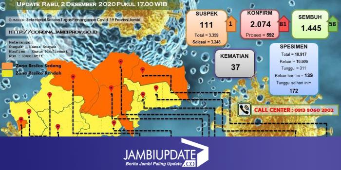 JAMBIUPDATE.CO, JAMBI – Kasus Positif Covid19 di Provinsi Jambi melonjak 81 orang pada Rabu (2/12). Penambahan ini merupakan angka tertinggi setelah sebelumnya sempat tercatat paling banyak 46 orang. Angka ini berbanding dengan kesembuhan sebanyak 58 orang.