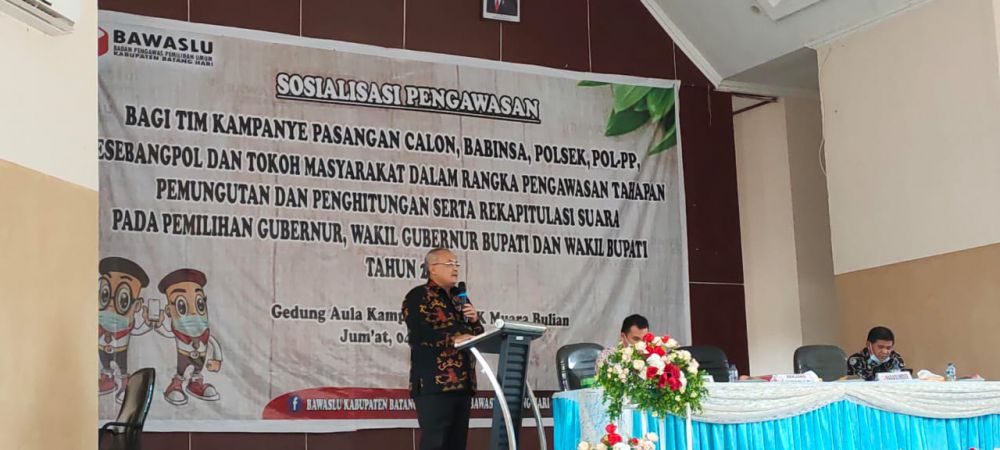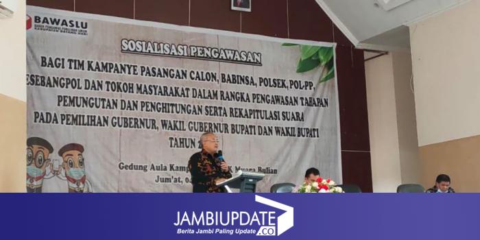 JAMBIUPDATE.CO, BATANGHARI - Badan Pengawas Pemilihan Umum (Bawaslu) Kabupaten Batanghari menggelar Sosialisasi Pengawasan bagi Tim Kampanye pasangan calon, Babinsa, Polsek, Sat Pol-PP Kesbangpol dan Tokoh Masyarakat dalam rangka pengawasan tahapan pemungutan dan penghitungan serta rekapitulasi suara pada Pemilihan Gubernur, Wakil Gubernur, Bupati dan Wakil Bupati tahun 2020. Jumat (04/12).