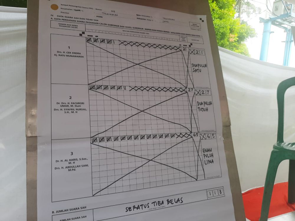 JAMBIUPDATE.CO, JAMBI- Pasangan Calon Gubernur nomor urut 3 Al Haris- Abdullah Sani juga unggul di TPS 07 di dekat kantor kejaksaan tinggi jambi. Disana Al Haris unggul 65 Suara dari dua kompetitornya.