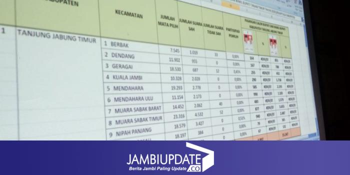 JAMBIUPDATE.CO, MUARASABAK - Pada hitung cepat sementara Pemilihan Bupati dan Wakil Bupati Tanjung Jabung Timur (Tanjabtim), Pasangan Calon Romi-Robby nomor urut 2 raih suara terbanyak dari lawannya Abdul Rasid-Mustakim nomor urut 1.