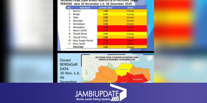 Juru bicara satgas penanganan Covid19 Provinsi Jambi Johansyah mengatakan, penetapan zona ini berdasarkan perkembangan kasus pada periode penelitian 30 November hingga 6 Desember.