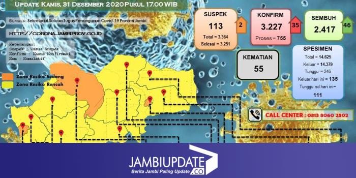JAMBIUPDATE.CO, JAMBI - Juru bicara satgas penanganan Covid-19 Provinsi Jambi Johansyah menyampaikan, terdapat tambahan 35 orang positif Covid-19 pada hari ini (31/12).