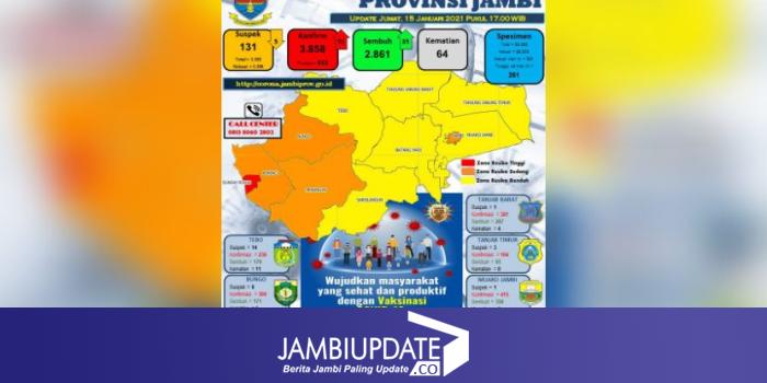 Total kasus Covid-19 di Jambi sudah sebanyak 3. 858. Dengan rincian 933 masih mendapatkan perawatan, sembuh 2.861. Dan angka kematian tak bertambah masih 64 orang dan ada 261 spesimen swab yang menunggu pengujian.
