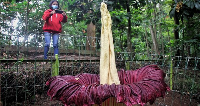 Tumbuhan itu mulai ramai jadi perbincangan sejak Sabtu (23/1) lalu. Bunga itu mekar berdiameter sekitar 1,5 meter dan tinggi mencapai dua meter.