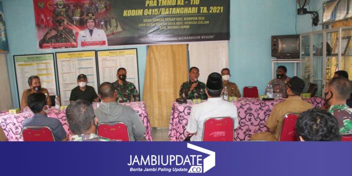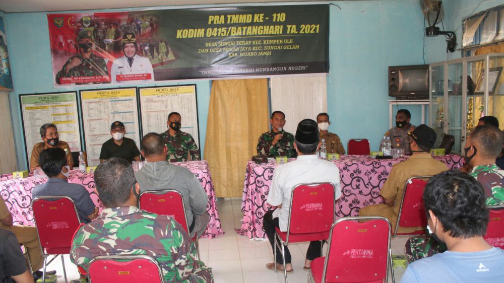 JAMBIUPDATE.CO, MUAROJAMBI - Komandan Komando Distrik Militer 0415/Batanghari Kolonel Inf J. Hadiyanto S.I.P., M.I.P, sosialisasikan pelaksanaan Tentara Manunggal Membangun Desa (TMMD) ke-110 Tahun 2021 di Wilayah Kodim 0415 Batanghari, yang digelar di Balai Desa Sungai Terap Kecamatan Kumpeh Ulu, Kabupaten Muarojambi, Selasa (9/2/2021).