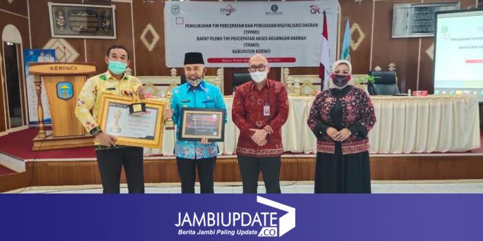 JAMBIUPDATE.CO, KERINCI - Bupati Kerinci, Adirozal, pada Kamis (25/02/2021) menerima sertifikat penghargaan dari Ketua Dewan Komisioner Otoritas Jasa Keuangan Republik Indonesia sebagai penggerak program inklusi tingkat Kabupaten/Kota dalam penyelenggaraan pertemuan tahunan Industri Jasa Keuangan 2021.