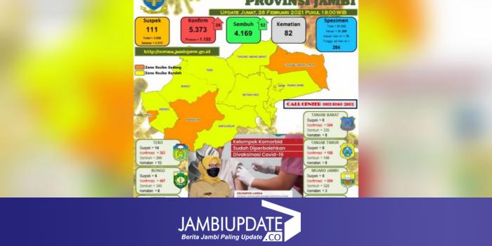 JAMBIUPDATE.CO, JAMBI - Laju penularan Covid-19 di Provinsi Jambi kembali bertambah. Terdapat 24 kasus baru pada Jumat (26/2). Angka positif covid-19 kemarin kalah dibandingkan pasien sembuh sebanyak 52 orang. Dan kabar baiknya, tak ada tambahan pasien Covid-19 yang meninggal dunia.