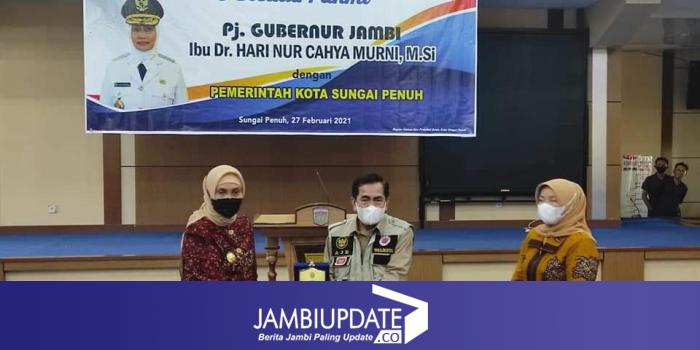 JAMBIUPDATE.CO, SUNGAIPENUH - Walikota H.Asafri Jaya Bakri (AJB) didampingi Ketua TP PKK, Hj Emizola Asafri, bersama Wakil Walikota, H.Zulhelmi menerima kunjungan kerja Pj Gubernur Jambi, Dr. Hari Nur Cahya Murni, M.Si dan rombongan di Kota Sungai Penuh, Sabtu (27/2).