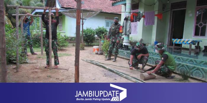 JAMBIUPDATE.CO, JAMBI - Satgas TMMD ke 110 Kodim 0415/Batanghari dari satuan Yonzipur 2/SG, di Desa Sungaiterap, membantu orang tua asuh dalam membuat jemuran pakaian, Sabtu (6/3/2021) pagi.