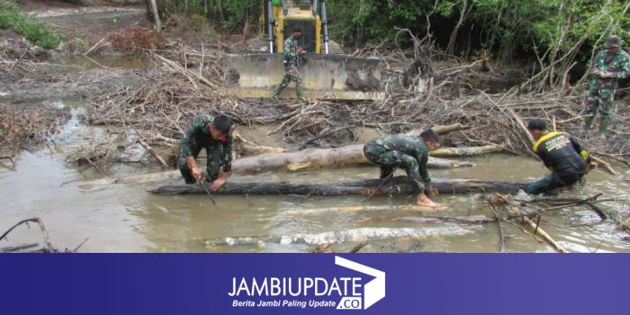 JAMBIUPDATE.CO, JAMBI - Warga Desa Sungaiterap bersama Satgas TMMD ke 110 Kodim 0415/Batanghari, bekerjasama untuk menggeluarkan alat berat jenis bulldozer yang terperosok ke dalam kanal, Minggu (7/3/2021).